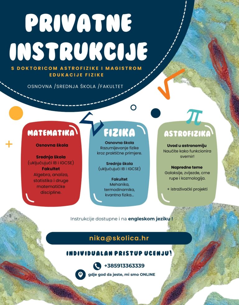 Privatne instrukcije s doktoricom astrofizike i magistrom edukacije fizike Osnovna škola, srednja škola, fakultet Instrukcije dostupne i na engleskom jeziku! Dobrodošli su svi – neovisno jeste li učenik, student ili samo zelite nauciti vise o